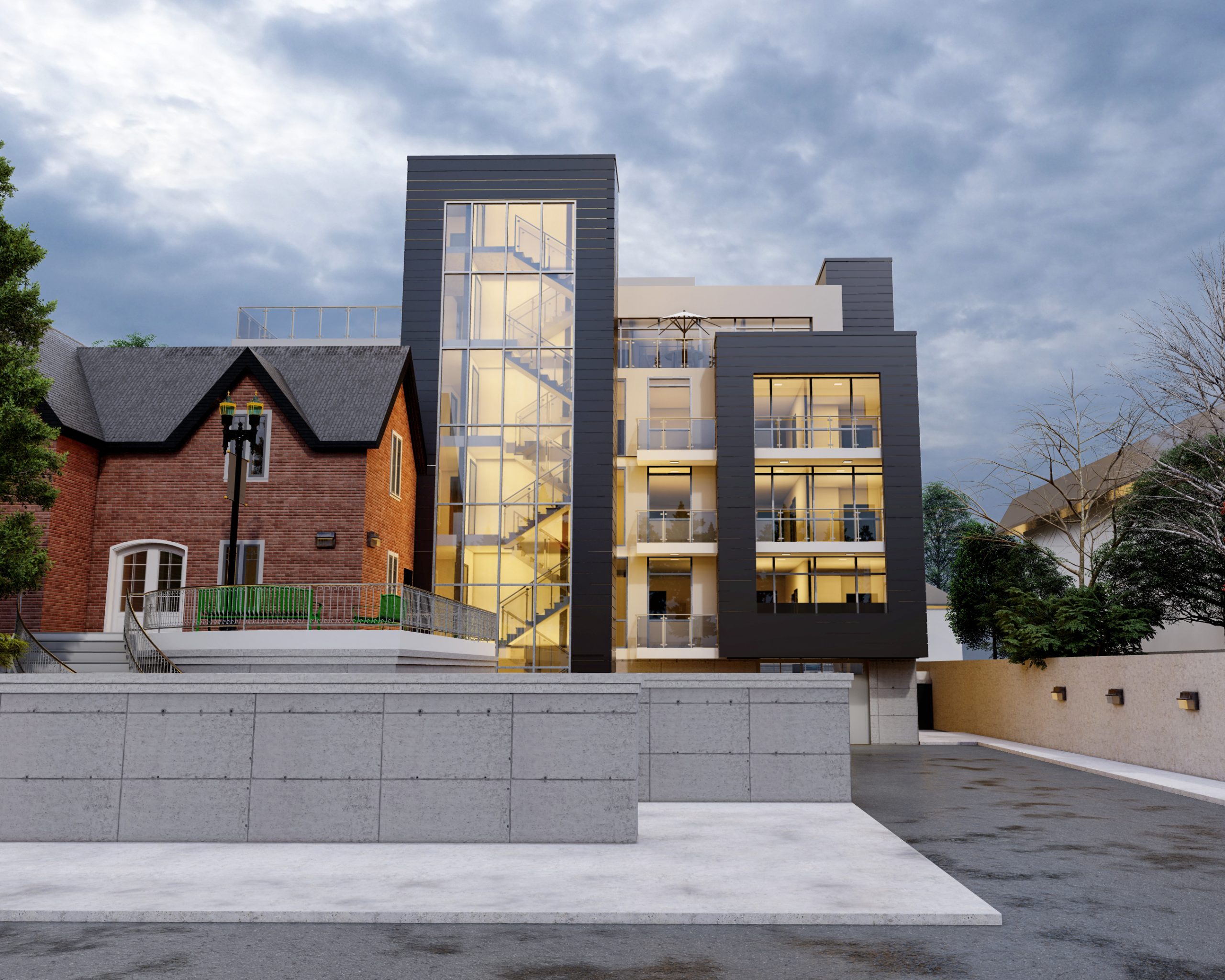 This new condominium building will incorporate an existing heritage house . The intent of the design is to create a modern glass building which will not detract from the heritage building. the new mass is sympathetic with the existing house scale and it compliments its aspects not “imitating” the heritage design language. As a result, the heritage house will continue to stand out and be the prominent focal point of this site. The new building will have 19 units with 3 storeys.