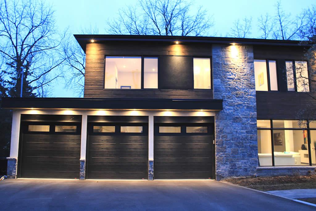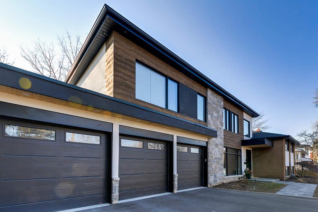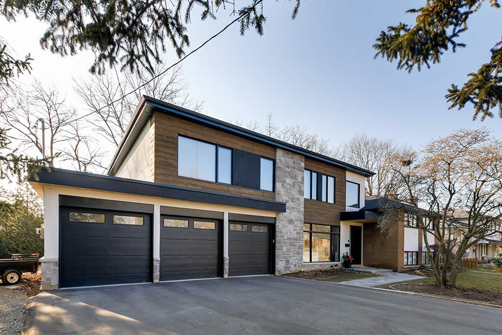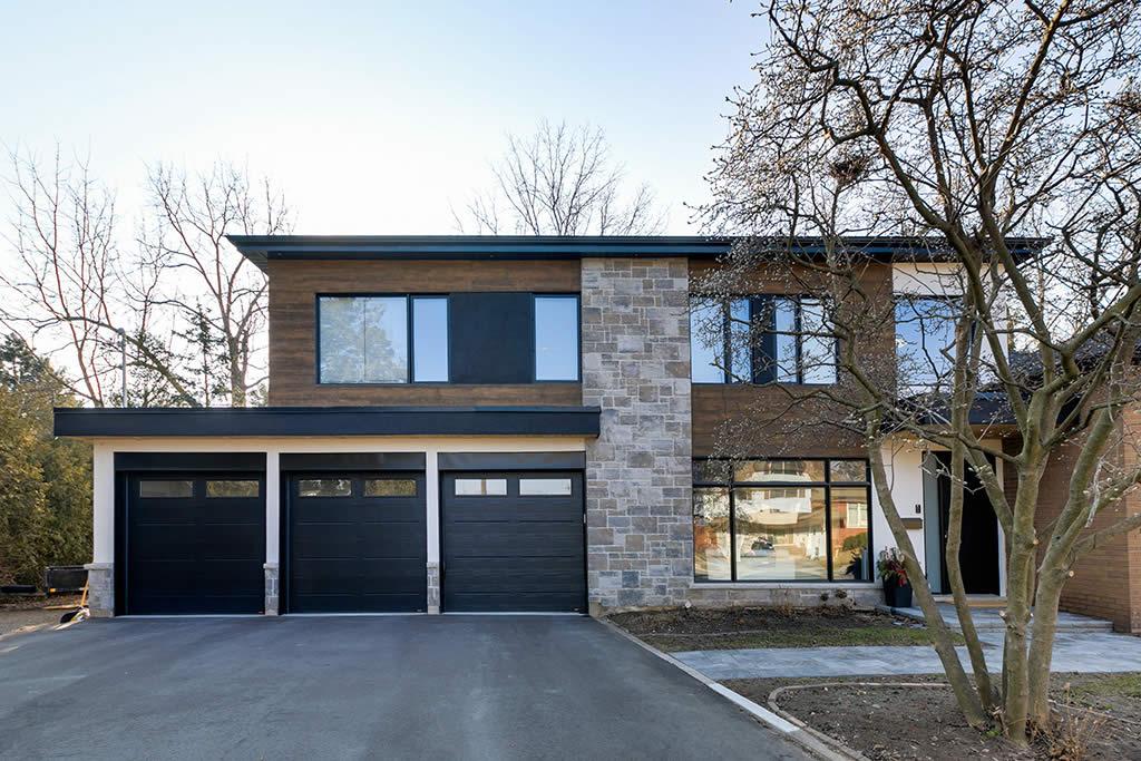 Contemporary re-build and addition to an existing side split house in Burlington. We used a combination of stone and architectural wood looking cement panels as accent to “break” the stucco walls. The elongated canopy ties in the 3 car garage to the house and gives it a striking horizontal line.