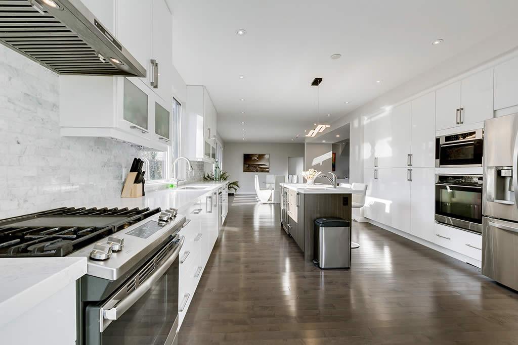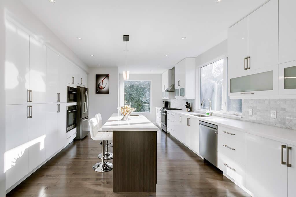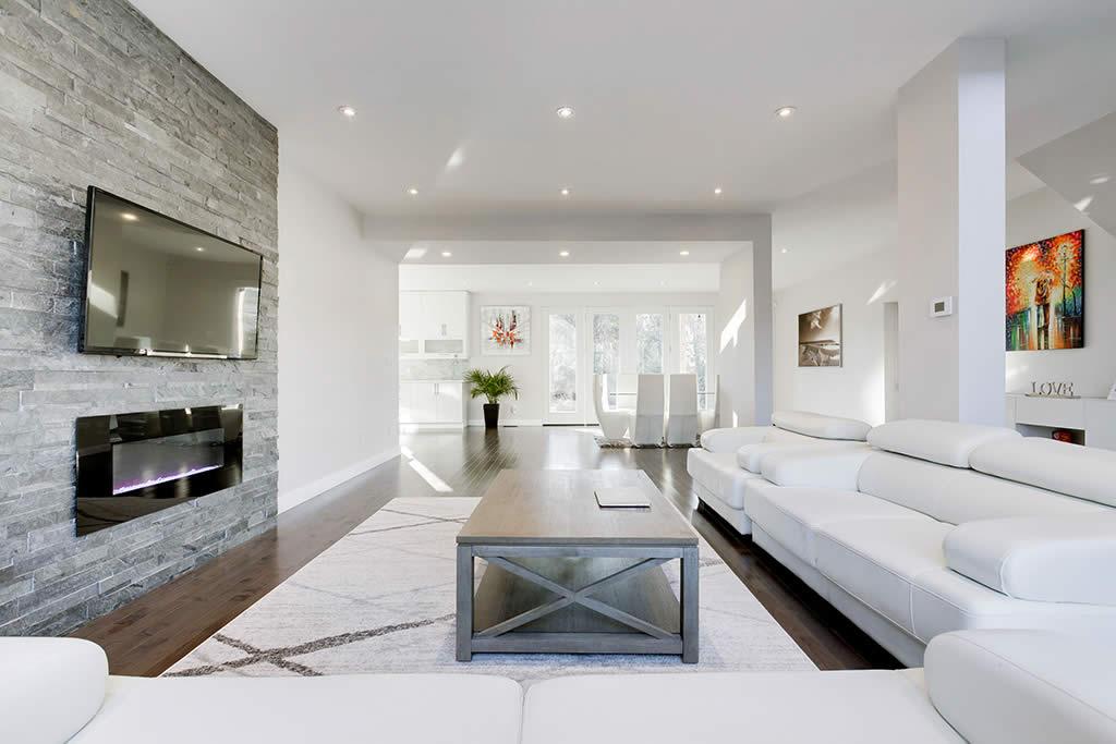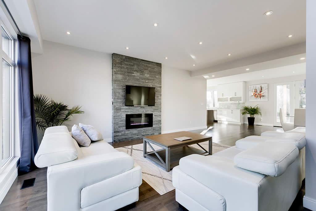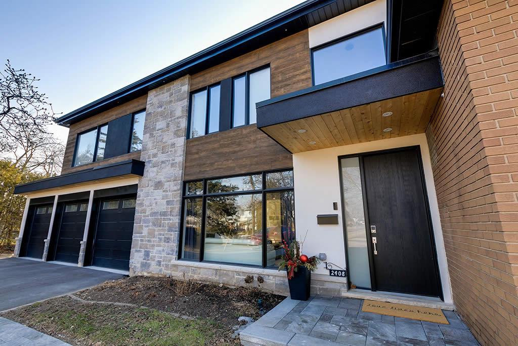 Contemporary re-build and addition to an existing side split house in Burlington. We used a combination of stone and architectural wood looking cement panels as accent to “break” the stucco walls. The elongated canopy ties in the 3 car garage to the house and gives it a striking horizontal line.