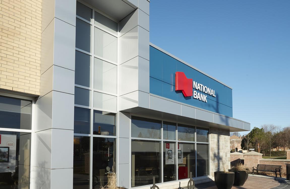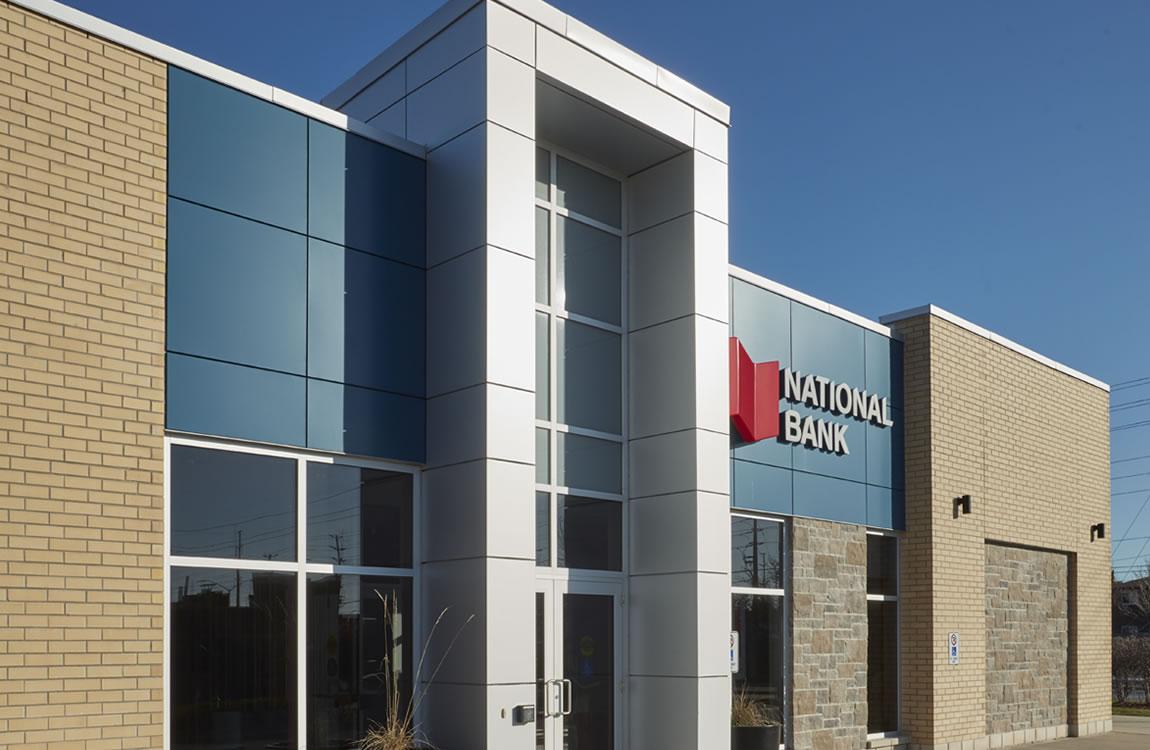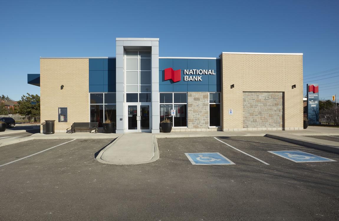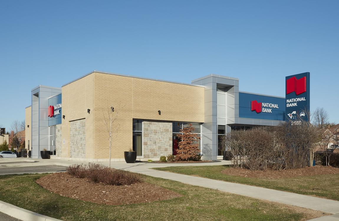 National Bank Oakville branch.  New building on the corner of Winston Churchill and Sheridan Garden Dr. Pleasant curb appeal with the use of complimentary materials and and striking canopy design. This building was designed by Fernando Lima while working at ATA Architects.