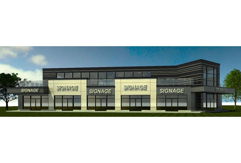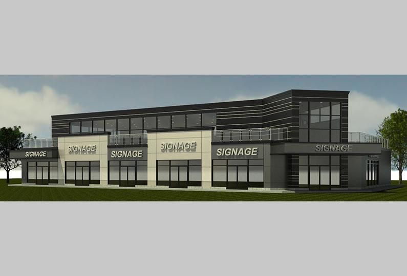 New 15,300 s.f. commercial building on Port Robinson Rd. Located on a corner street , this building will have commercial units on the ground floor and office space on the 2nd floor. Special attention has been given to the corner design of the building which will be the prominent feature creating a strong and pleasant identity to this corner. The 2nd floor office space is set back from the main font wall of the ground level to create a terrace on the 2nd level articulating and “breaking” the mass of the building. The building is also located close to the street to be in line with the new urban design guidelines promoting pedestrian circulation and to screen the parking area from public view. The building is of contemporary design with high quality materials with the intention to become a landmark for this street intersection.