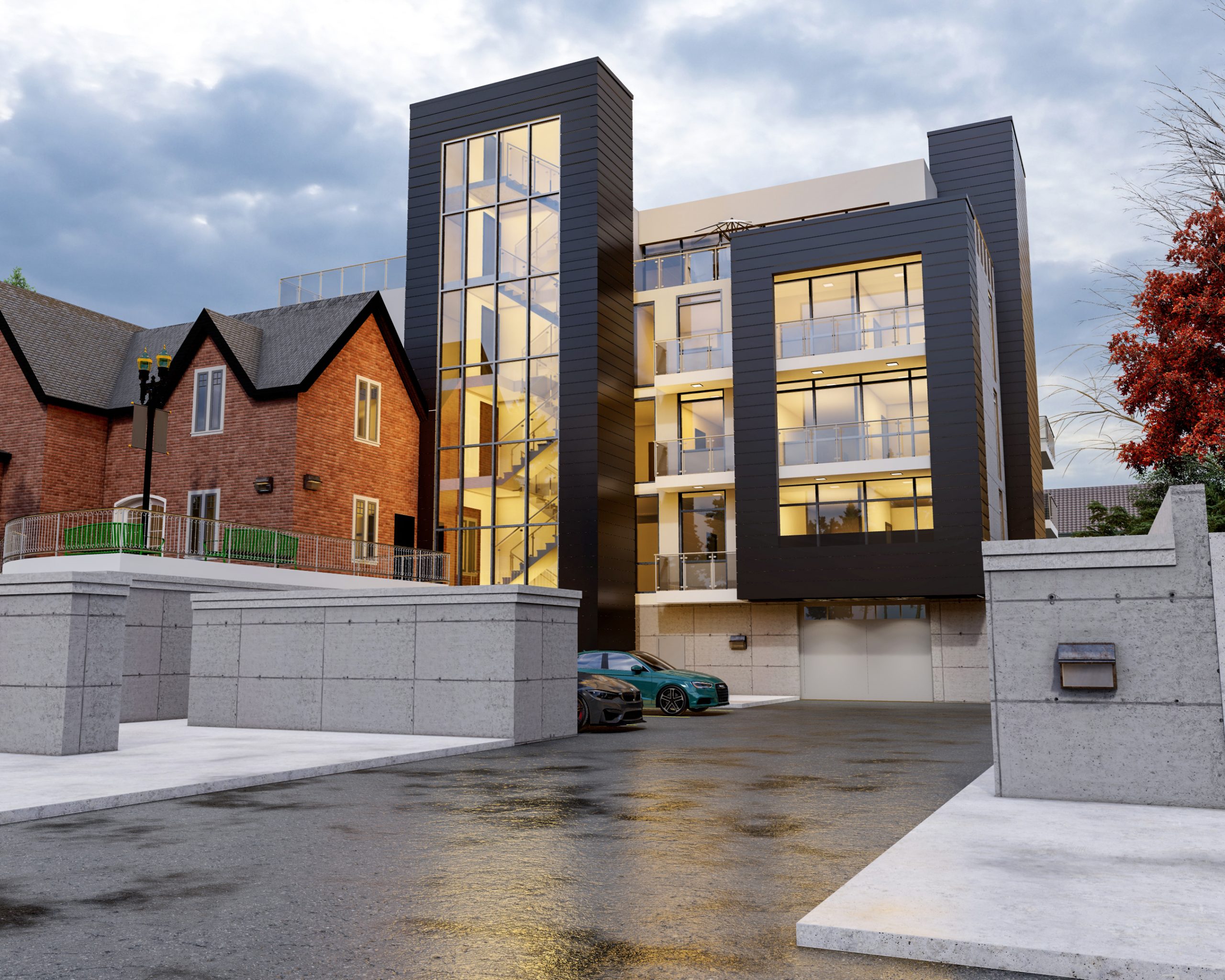 This new condominium building incorporates an existing heritage house. The intent of the design was to create a modern glass building which won’t detract from the heritage building. The new mass is sympathetic with the existing house scale, and it compliments its aspects not “imitating” the heritage design language. As a result, the heritage house continues to stand out and be the prominent focal point of this site. The new building has 19 units with 3 storeys.