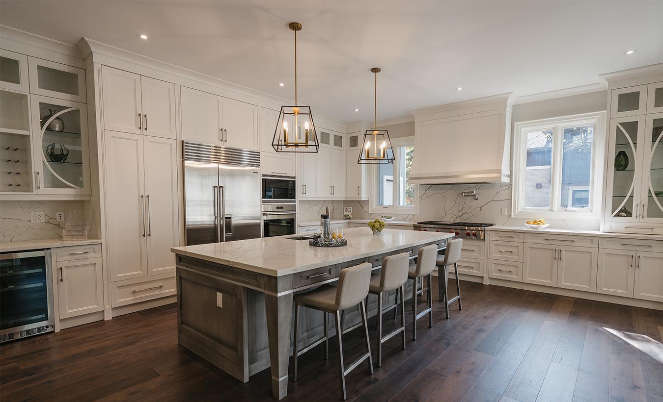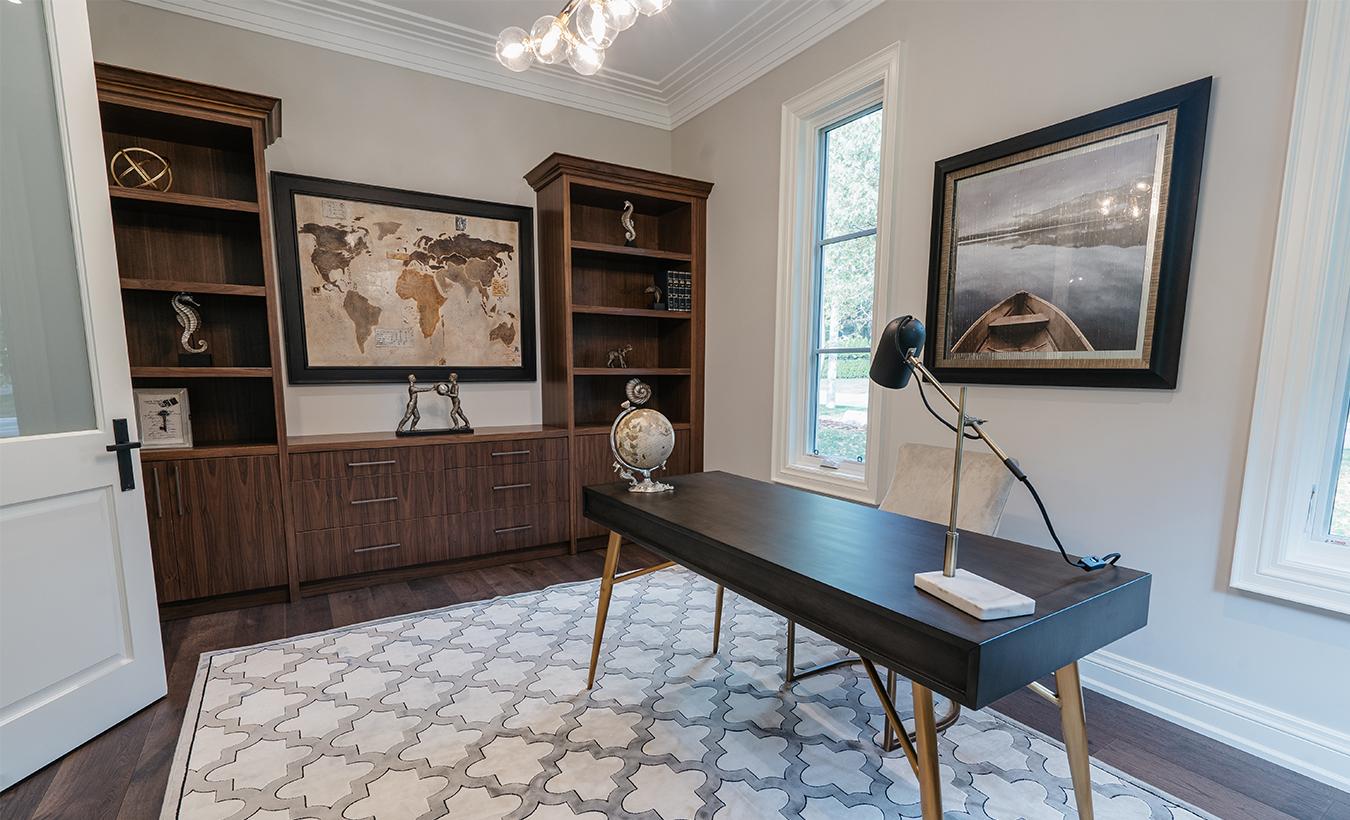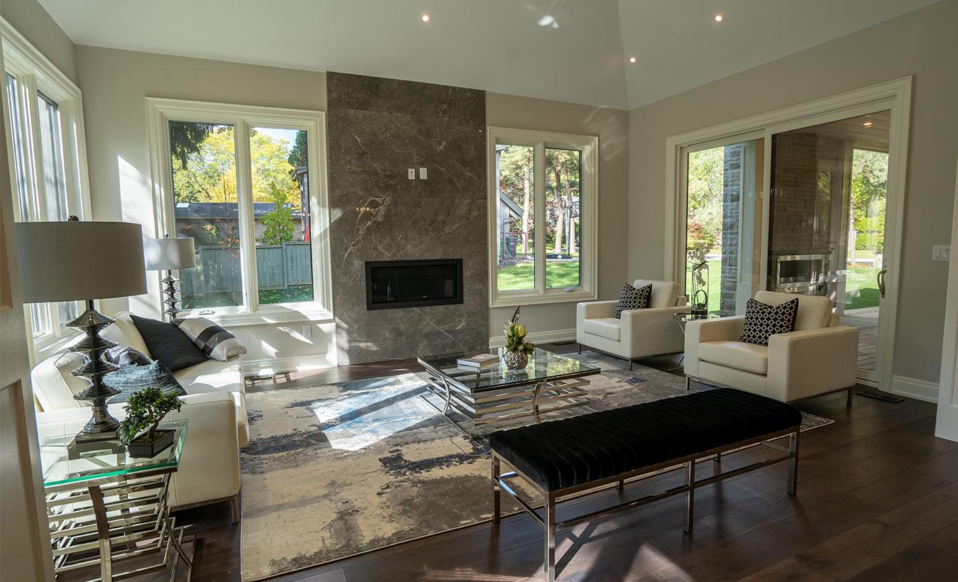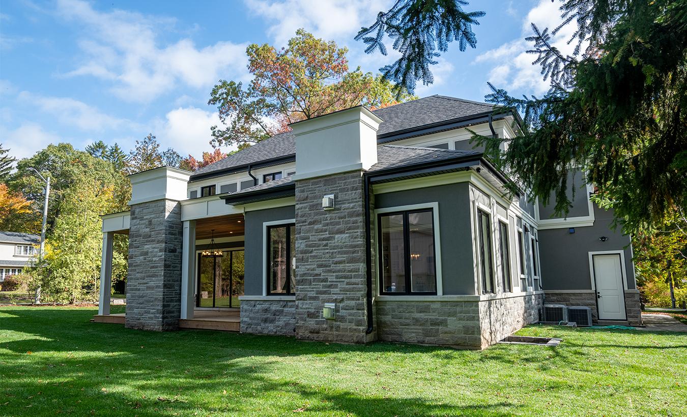 A new modern/transitional custom home in Mississauga, this house is in a prestigious area close to Lake Ontario. The low-pitched roof, along with the large, glazed areas and its massing give this home a more modern approach. The main materials are stone and wood siding, which makes this house integrate well with its landscaping.