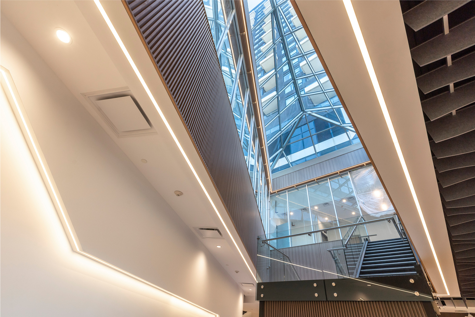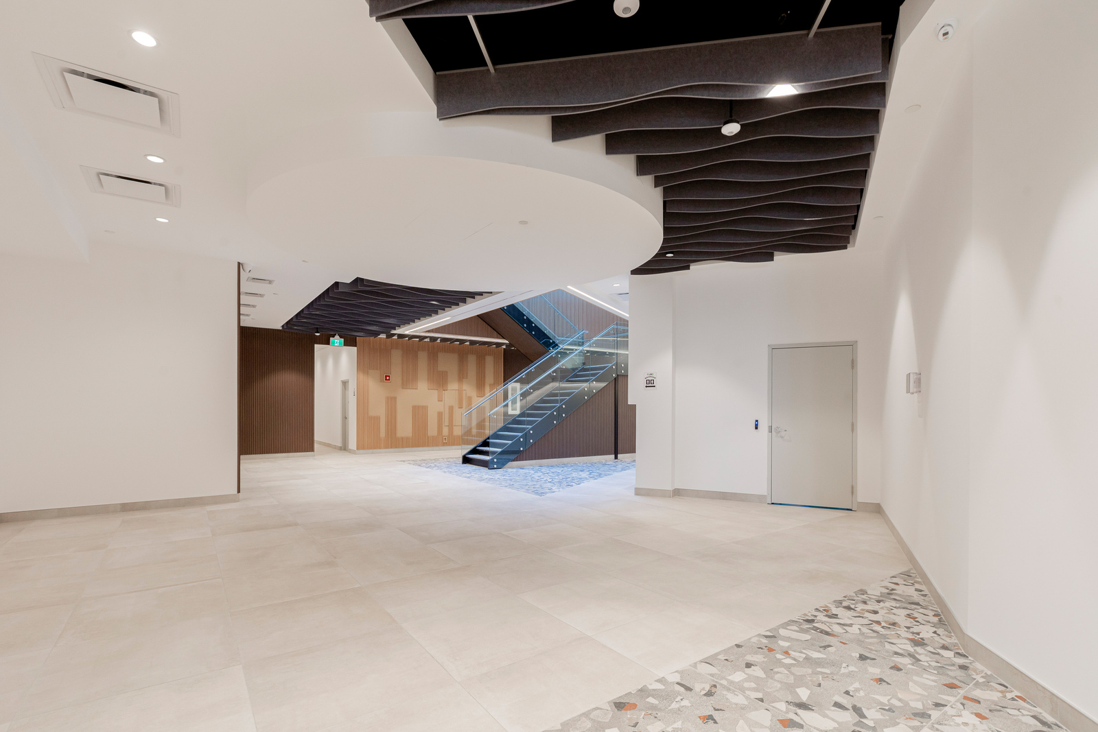 Above, wave-form acoustic baffles add depth and movement to the ceiling while improving sound quality. These carefully selected materials and details elevate the everyday experience of moving through the building.