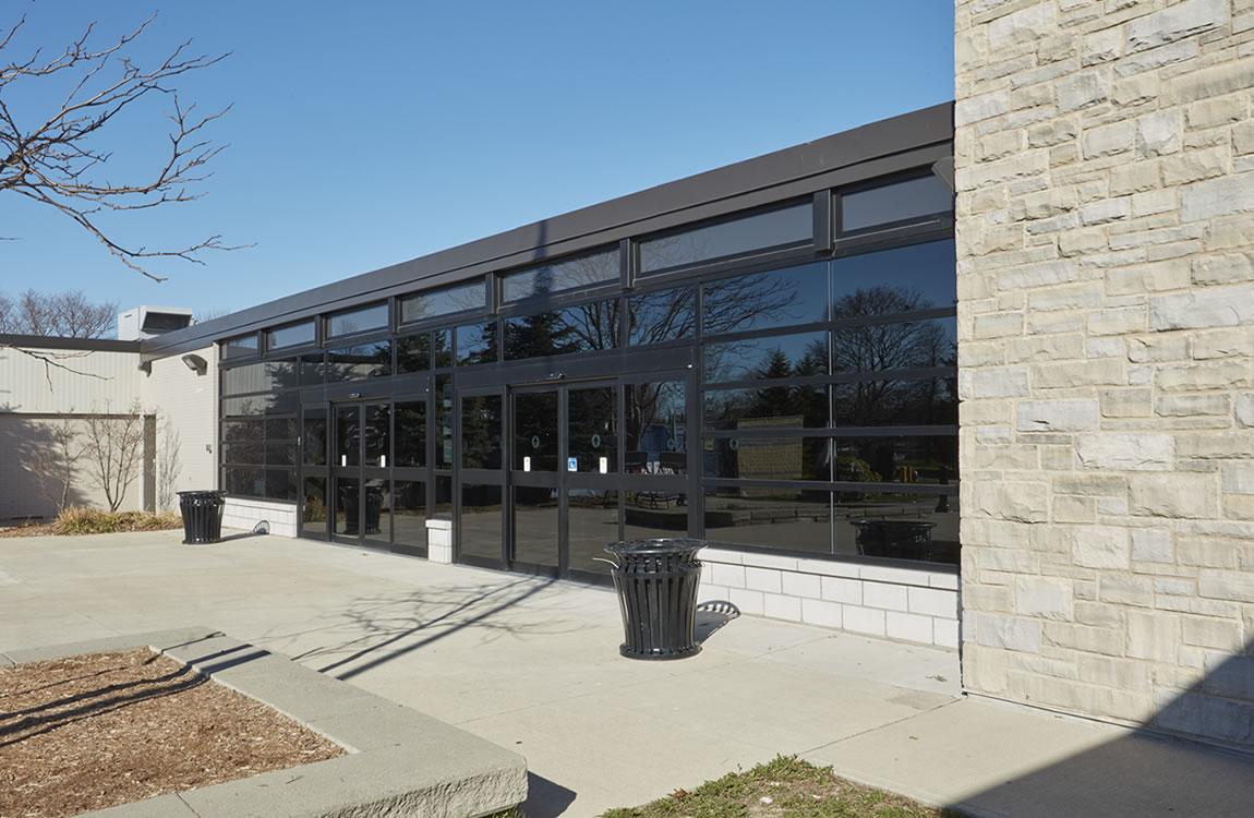 Burlington Nelson Arena addition and complete façade redesign. After we first designed, the city wanted to enhance the building entrance with more change rooms and washrooms. New glazing and sliding doors increased the area of the vestibule and modernized the overall building appearance.