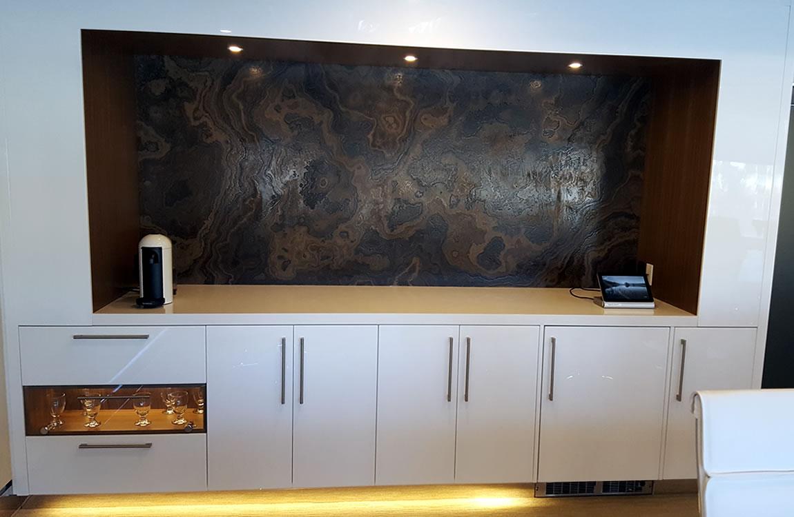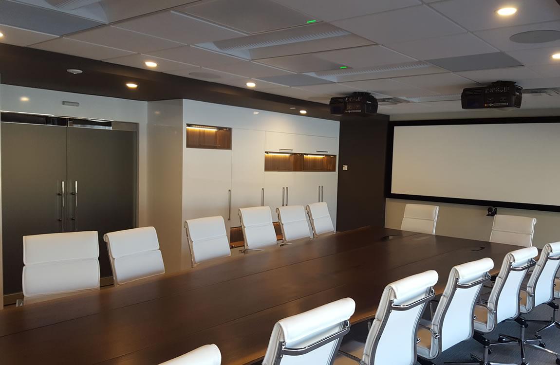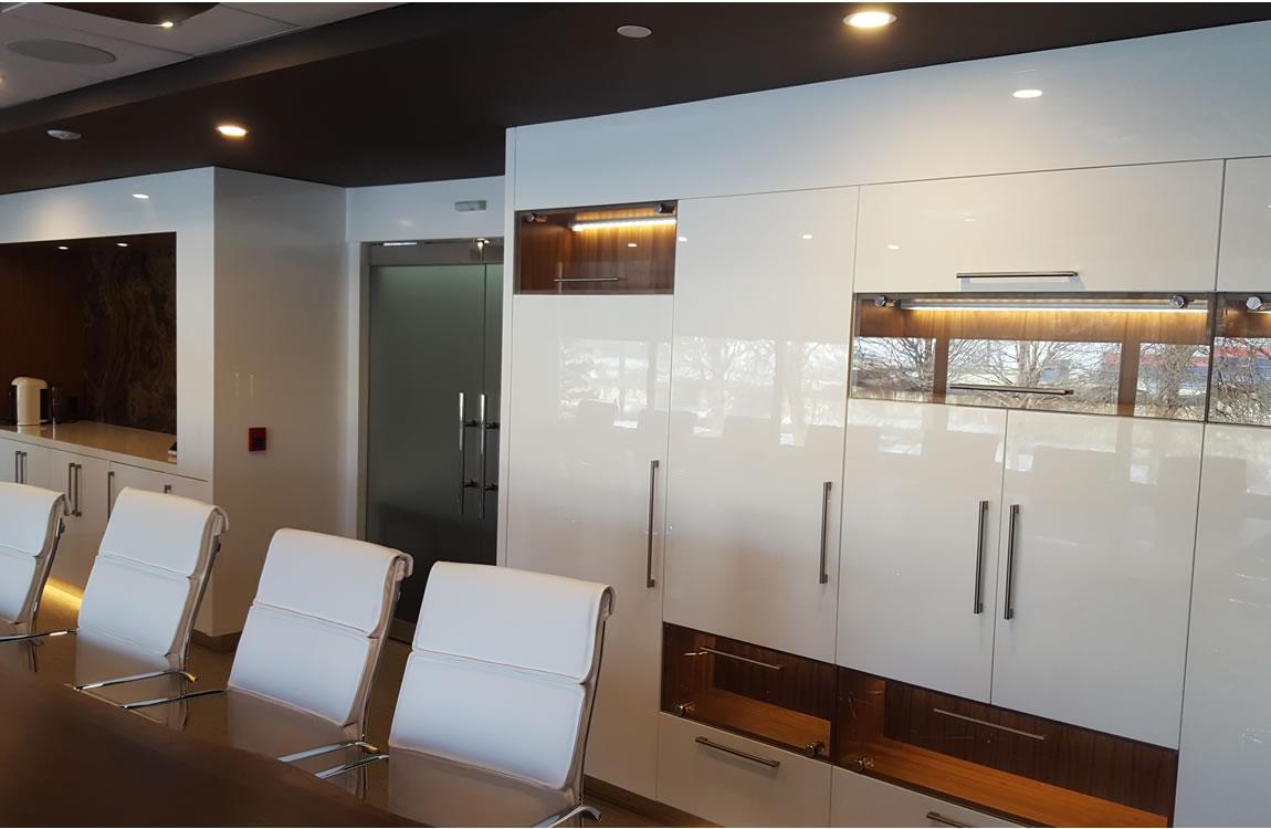 This project involved the renovation of a company’s private President’s Boardroom. It incorporated elegant finishes and simple contemporary design. The two millwork pieces were designed to integrate with the main door. This created a uniform look throughout the south side wall, making the main door the focal point of the room.