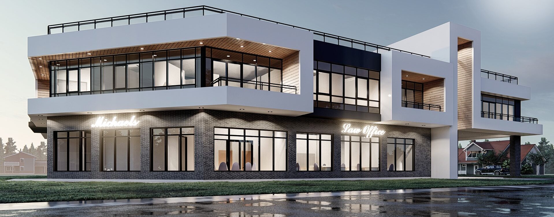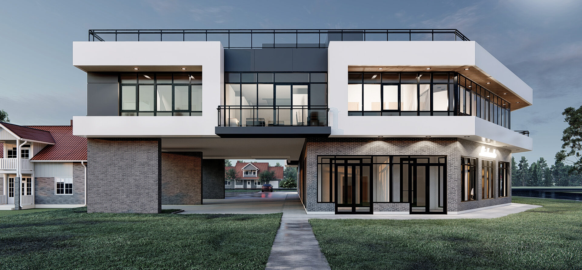 This building is located at a busy intersection on a corner lot in Hamilton, Ontario. The design needed to make a bold statement and have a pleasing curb appeal for us to obtain the support from the City’s planning staff. The concept follows the modern urban design guidelines with the building mass closer to the public sidewalks. This encourages pedestrian circulation and the parking is located at the rear and screened by the building itself. The building massing is “light” with large, glazed areas and simple shapes formed by light composite aluminum panels and well-defined lines.