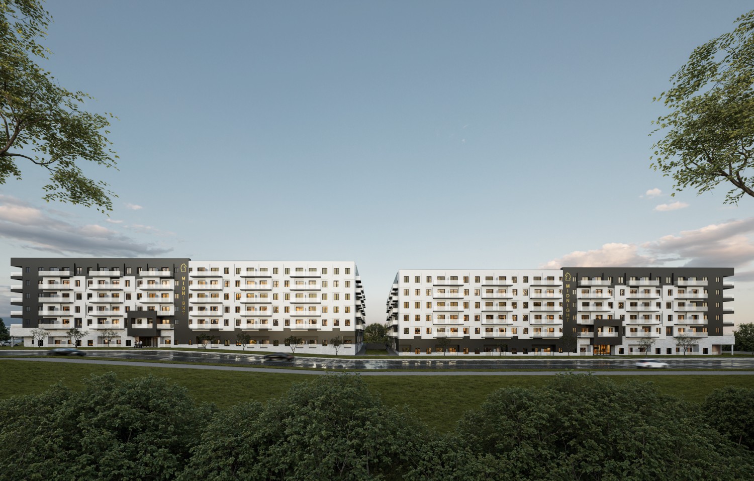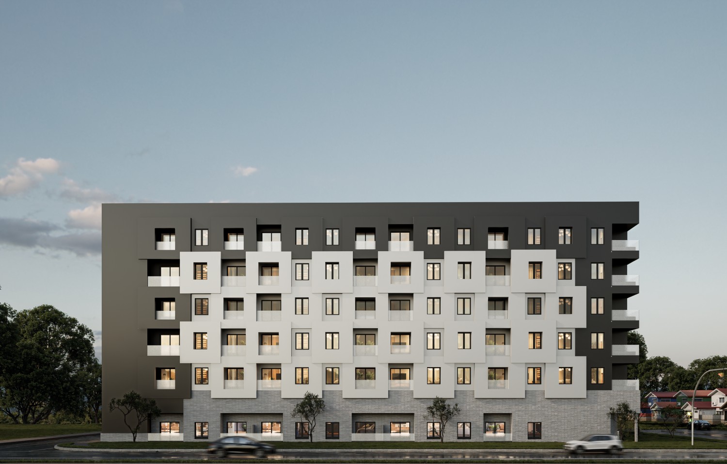 The design concept draws inspiration from the visual rhythm of a checkerboard. Meticulous attention has been given to ensuring that the adjacent buildings, while distinct in their individual expression, harmoniously complement each other. This elegant yet straightforward composition is intended to establish the development as a prominent landmark within the community.