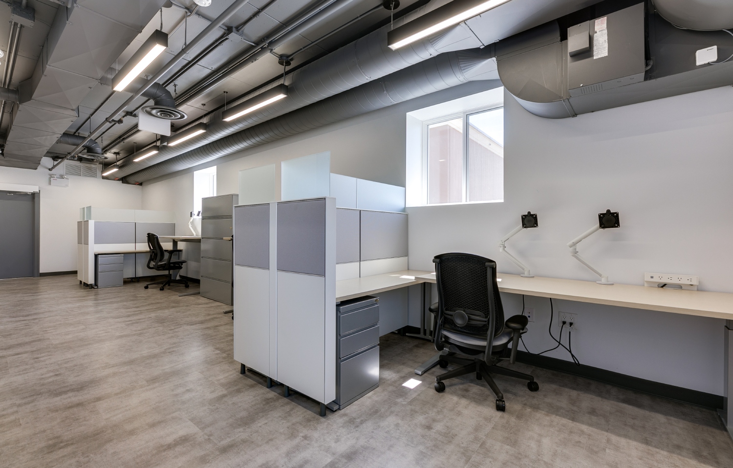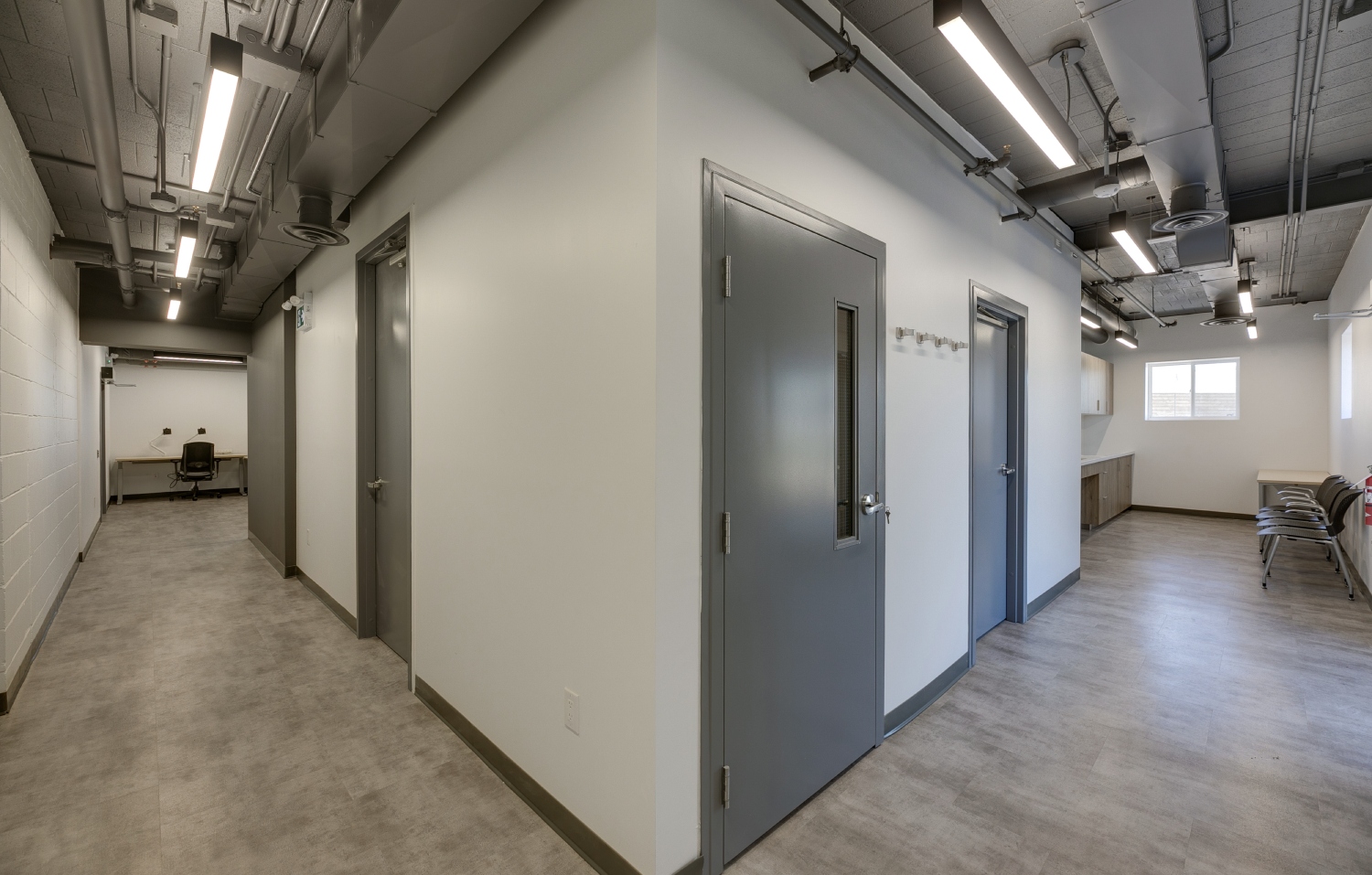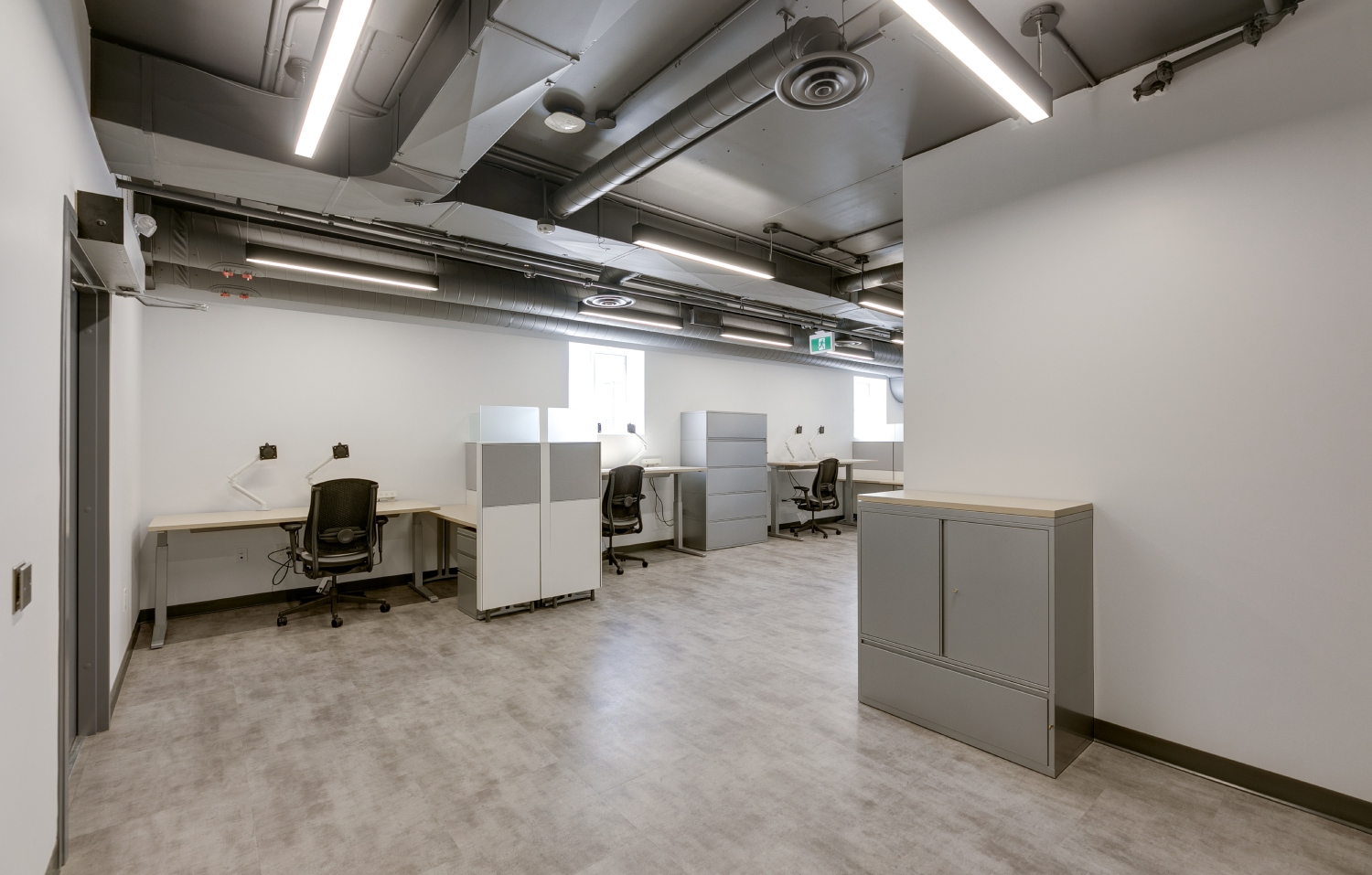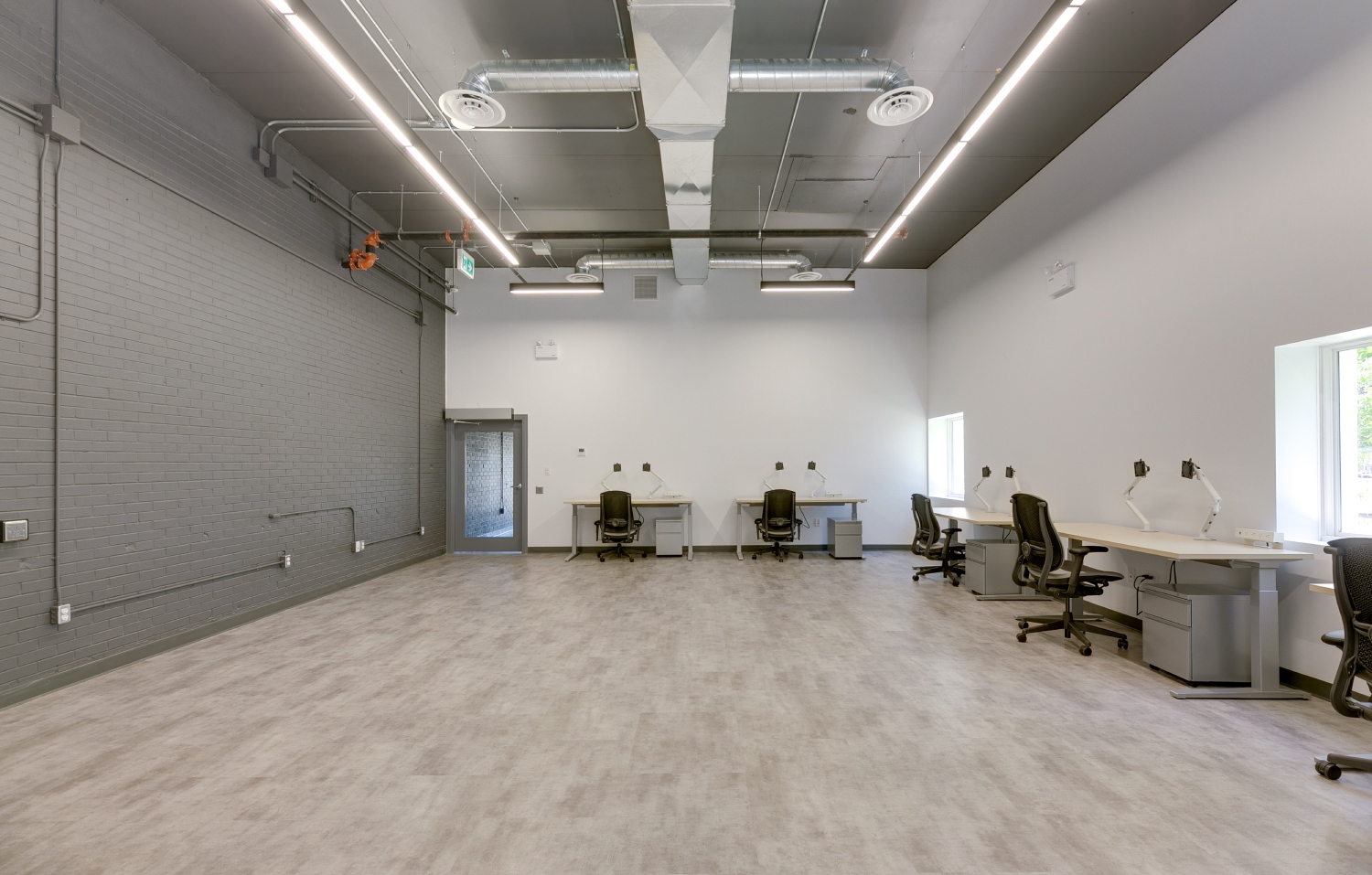 Inside, the transformation focuses on open-concept workspaces and exposed building systems that celebrate industrial honesty while fostering connectivity and productivity. The exposed ducts, suspended lighting, and neutral finishes create a sense of openness and modernity, balanced by natural light and refined detailing. Each space—from collaborative office zones to the breakout lounge and utility areas—has been designed for functional clarity and aesthetic cohesion.