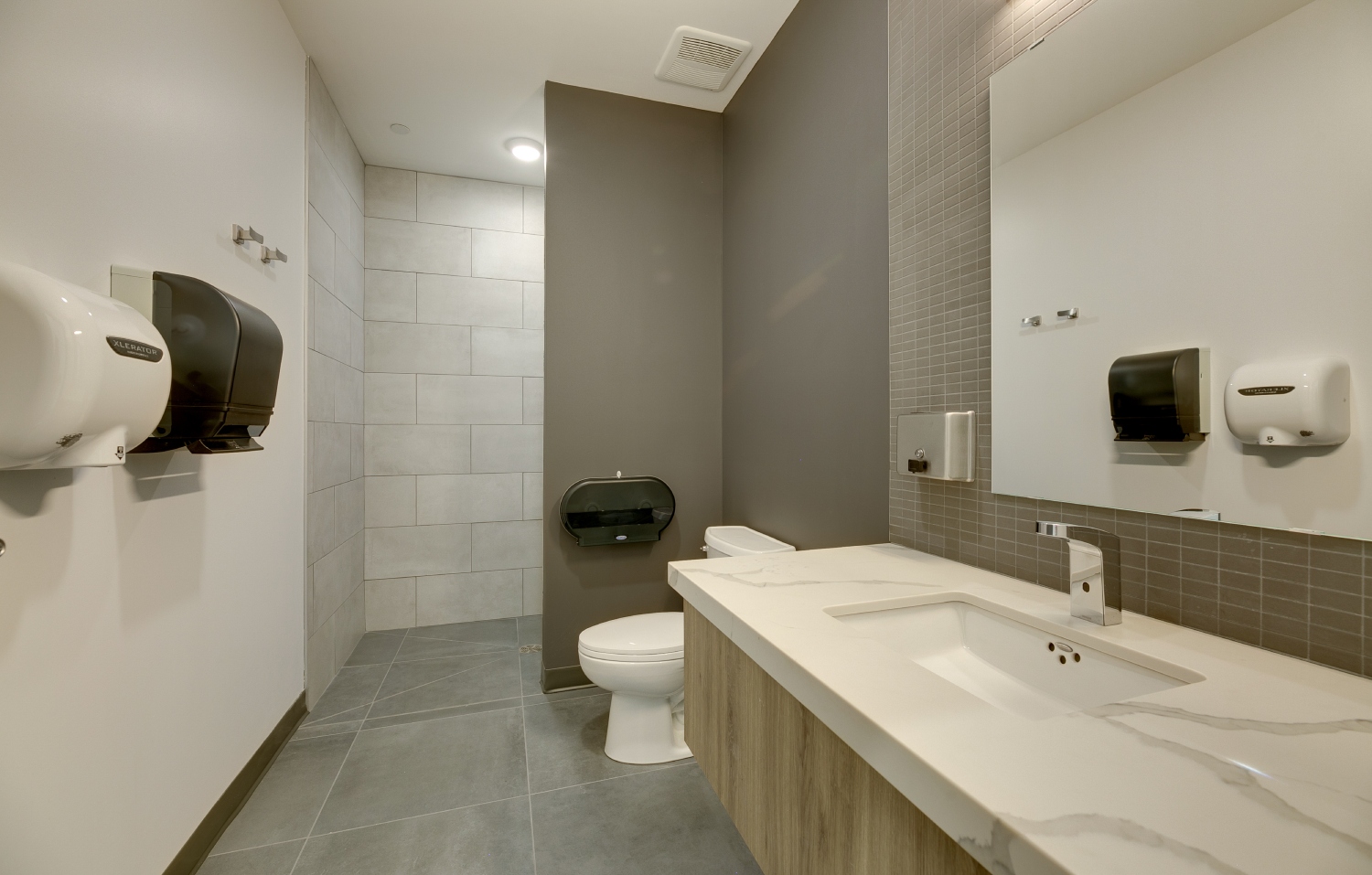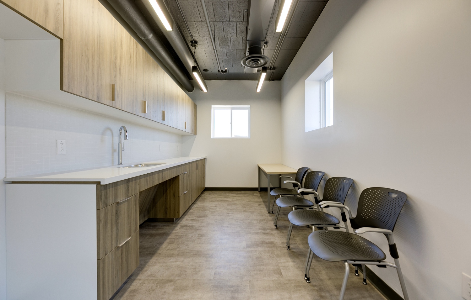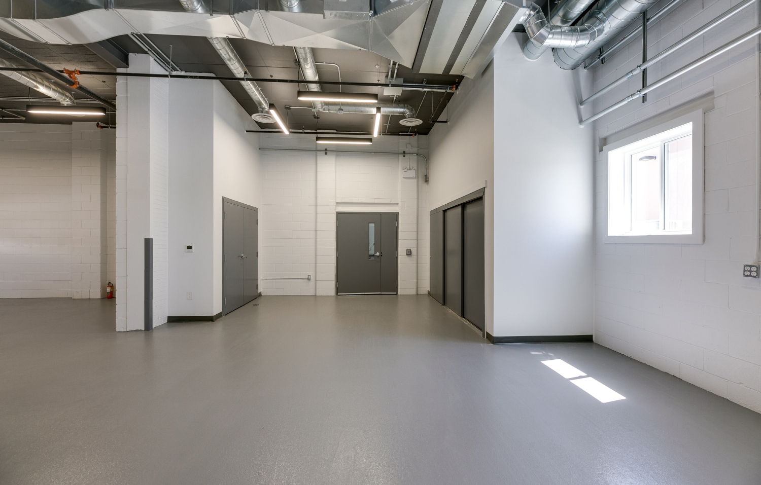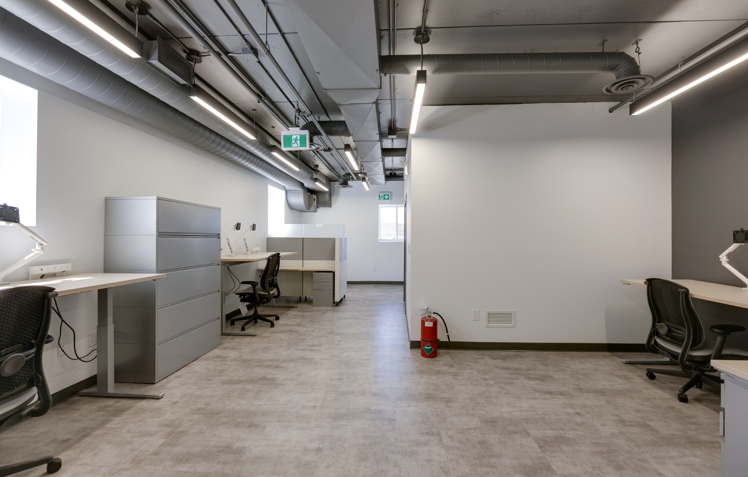 Inside, the transformation focuses on open-concept workspaces and exposed building systems that celebrate industrial honesty while fostering connectivity and productivity. The exposed ducts, suspended lighting, and neutral finishes create a sense of openness and modernity, balanced by natural light and refined detailing. Each space—from collaborative office zones to the breakout lounge and utility areas—has been designed for functional clarity and aesthetic cohesion.