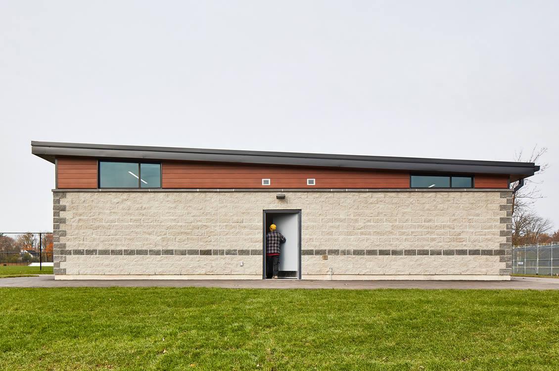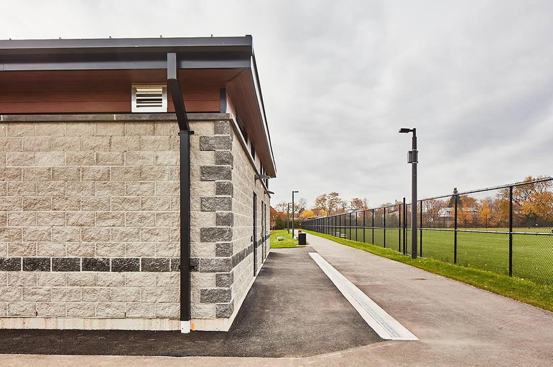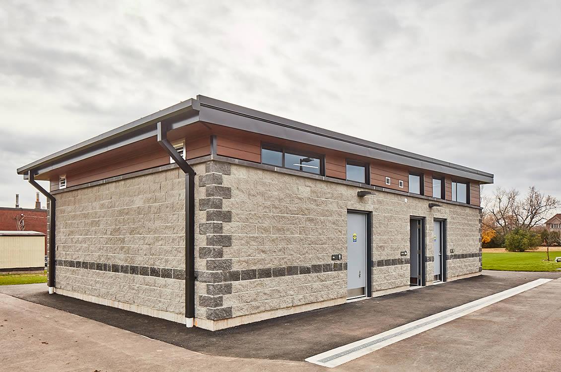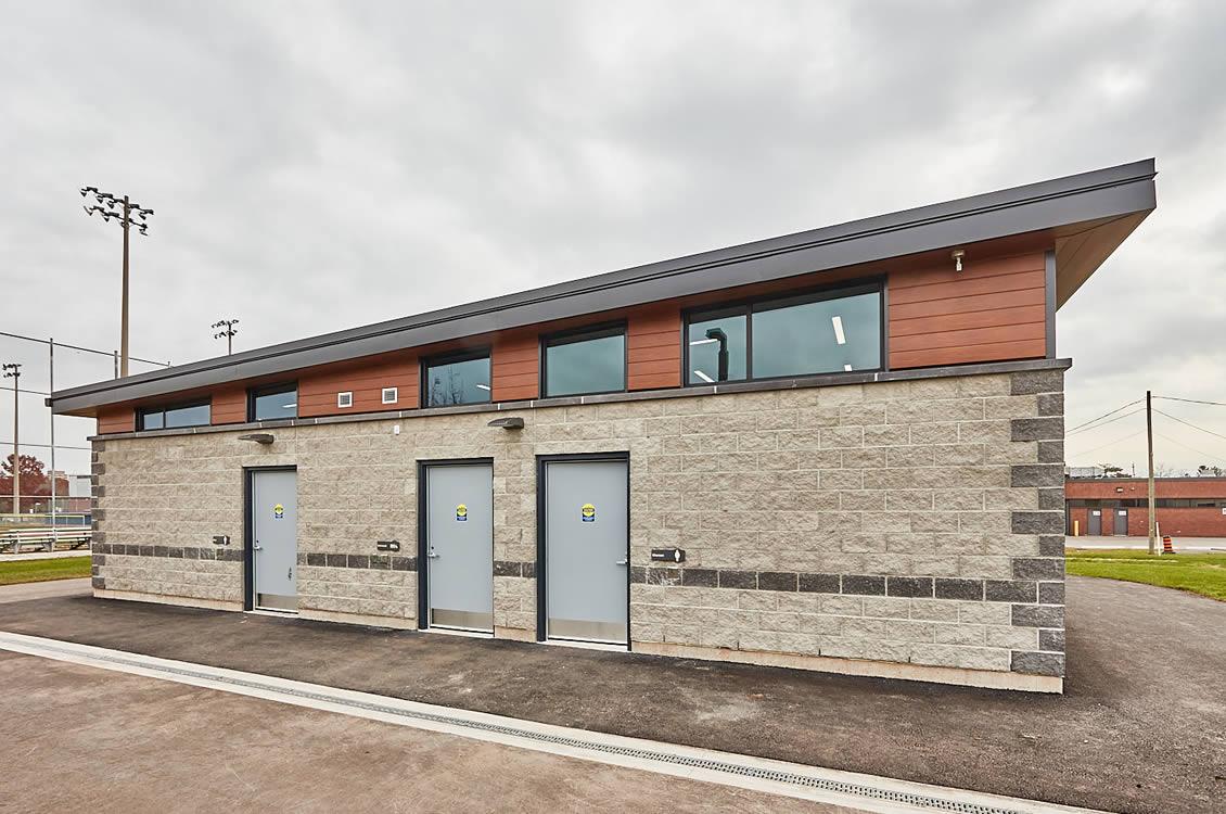 This project involved construction of a building facility for the new Oakville McCraney Park. This building houses male and female washrooms as well as an accessible universal washroom in compliance with the Town of Oakville accessibility guidelines. This modern design with its simple roof lines and composition of materials integrates well with the overall design of the park and its landscape.