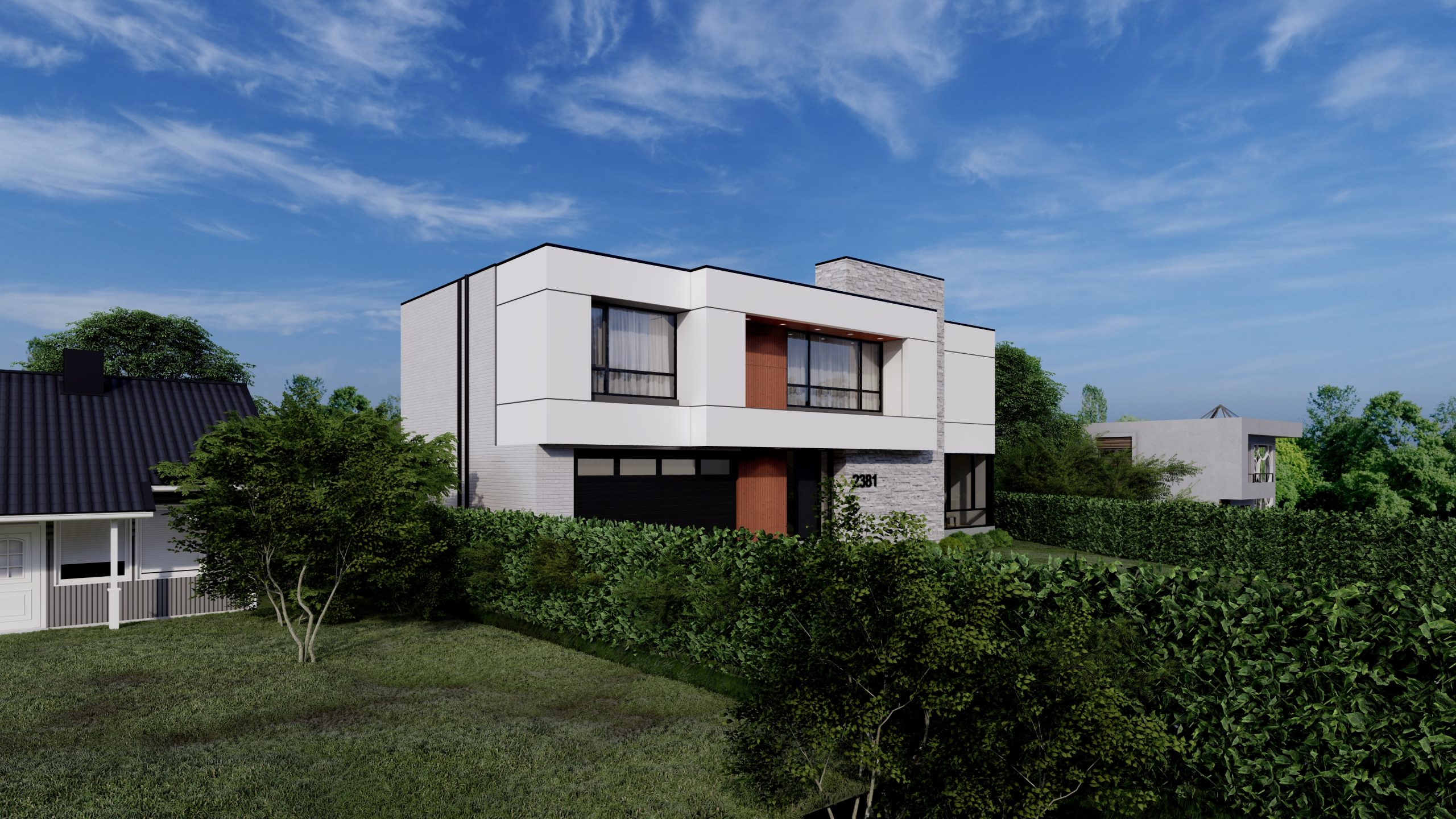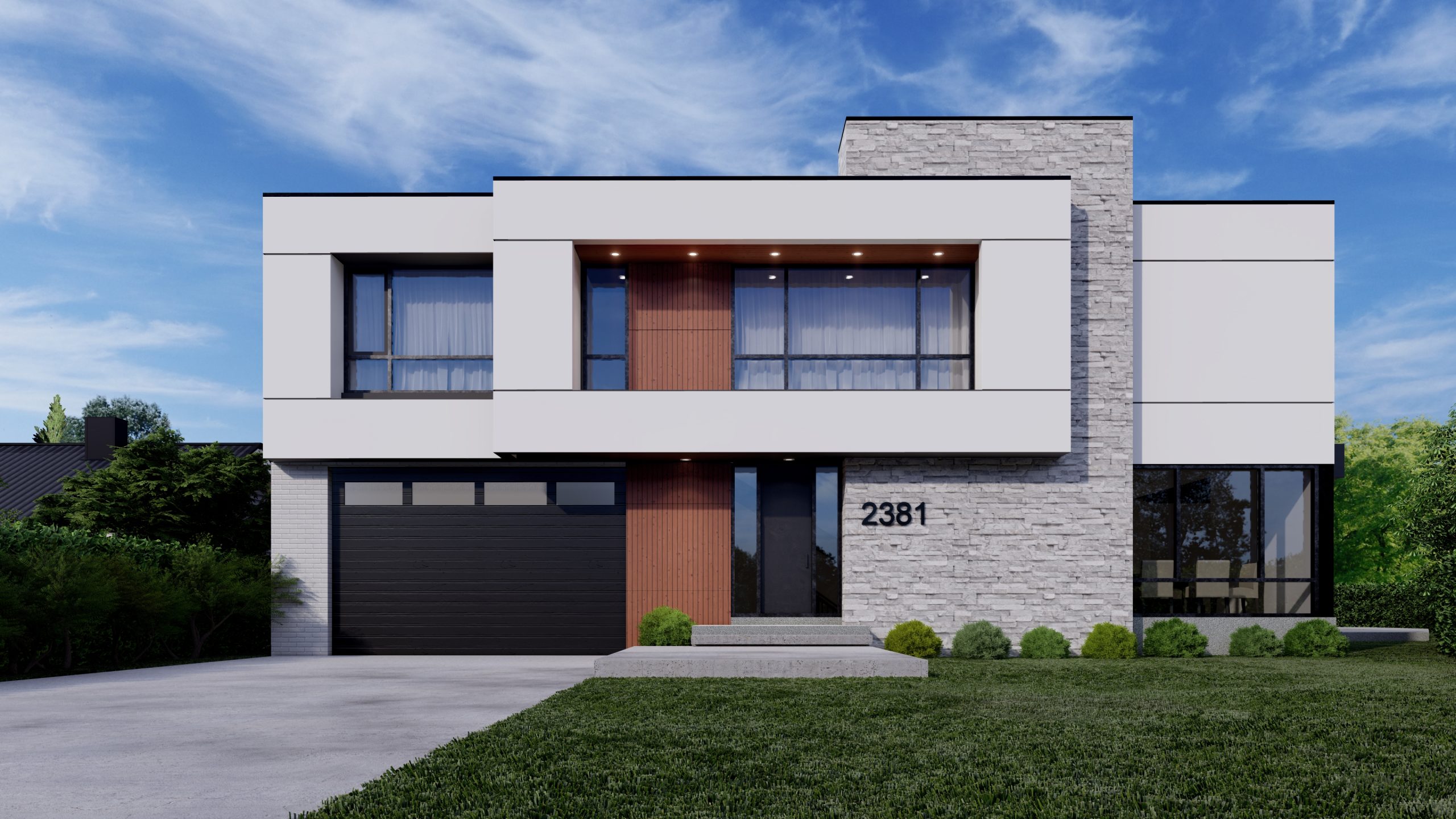 New modern custom home in Burlington, ON. Simple and yet prominent. This contemporary house has an interesting play of shapes, massing and voids. The main material of the house is white EIFS with a powerful stone wall that “anchors” the light shapes to the ground. The wood siding detail softens and warms up the design.