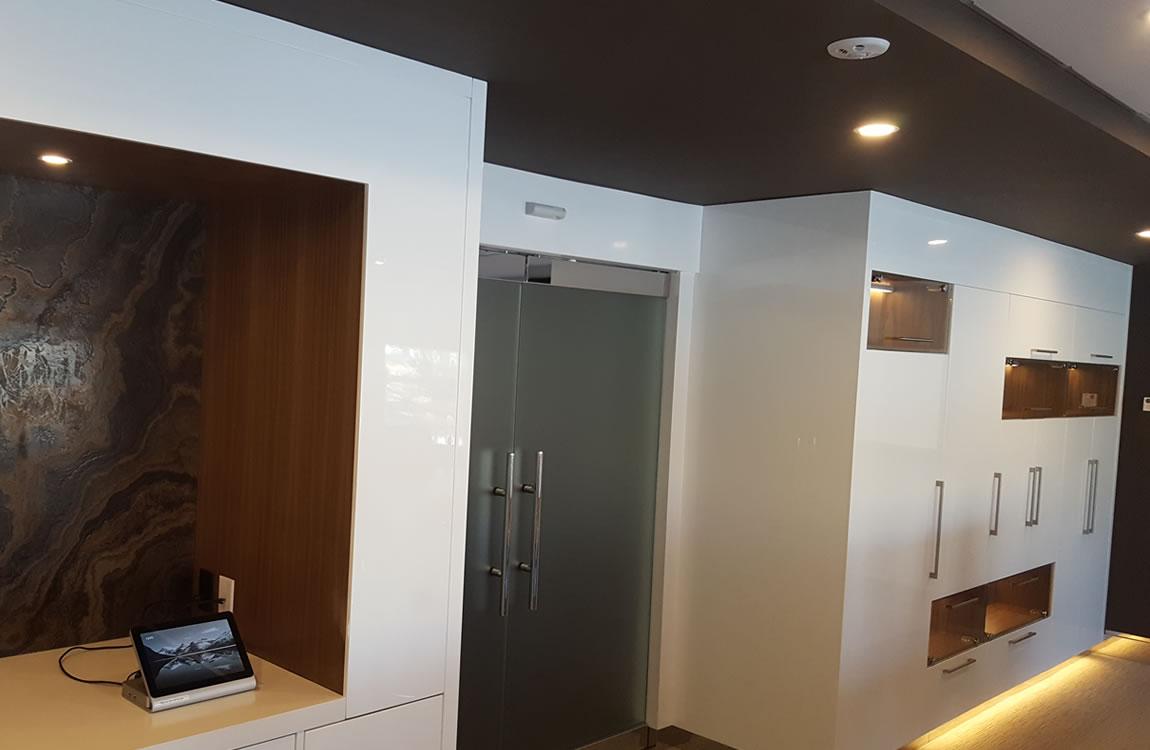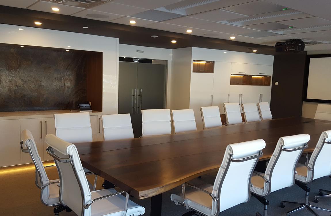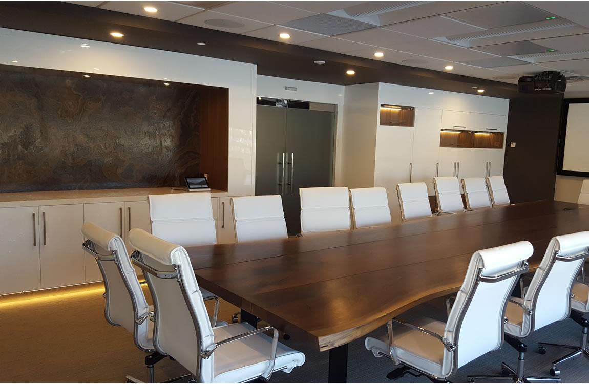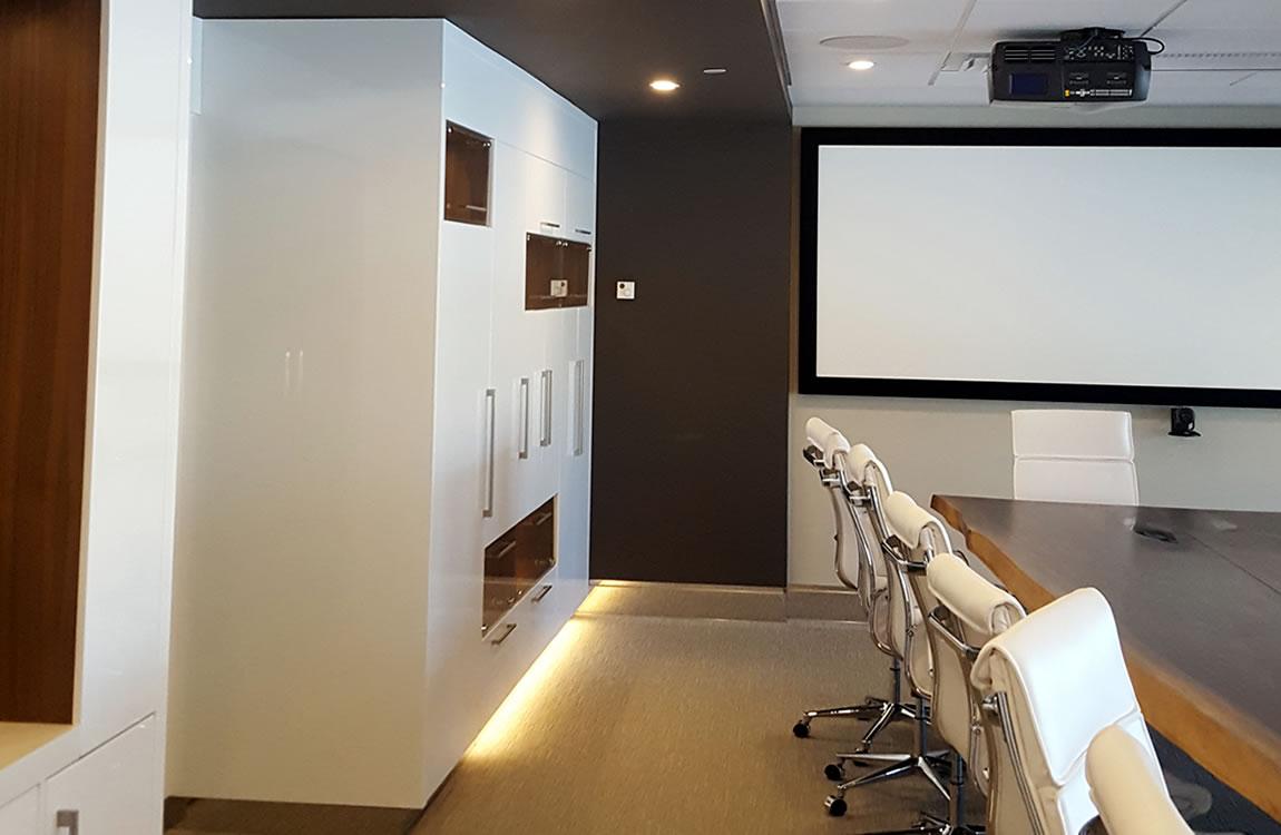 Renovation of company private President’s Board Room. Elegant finishes and simple contemporary design. The two millwork pieces were designed to integrate with main door creating a uniform look throughout the south side wall and making the main door as the focal point of the room.