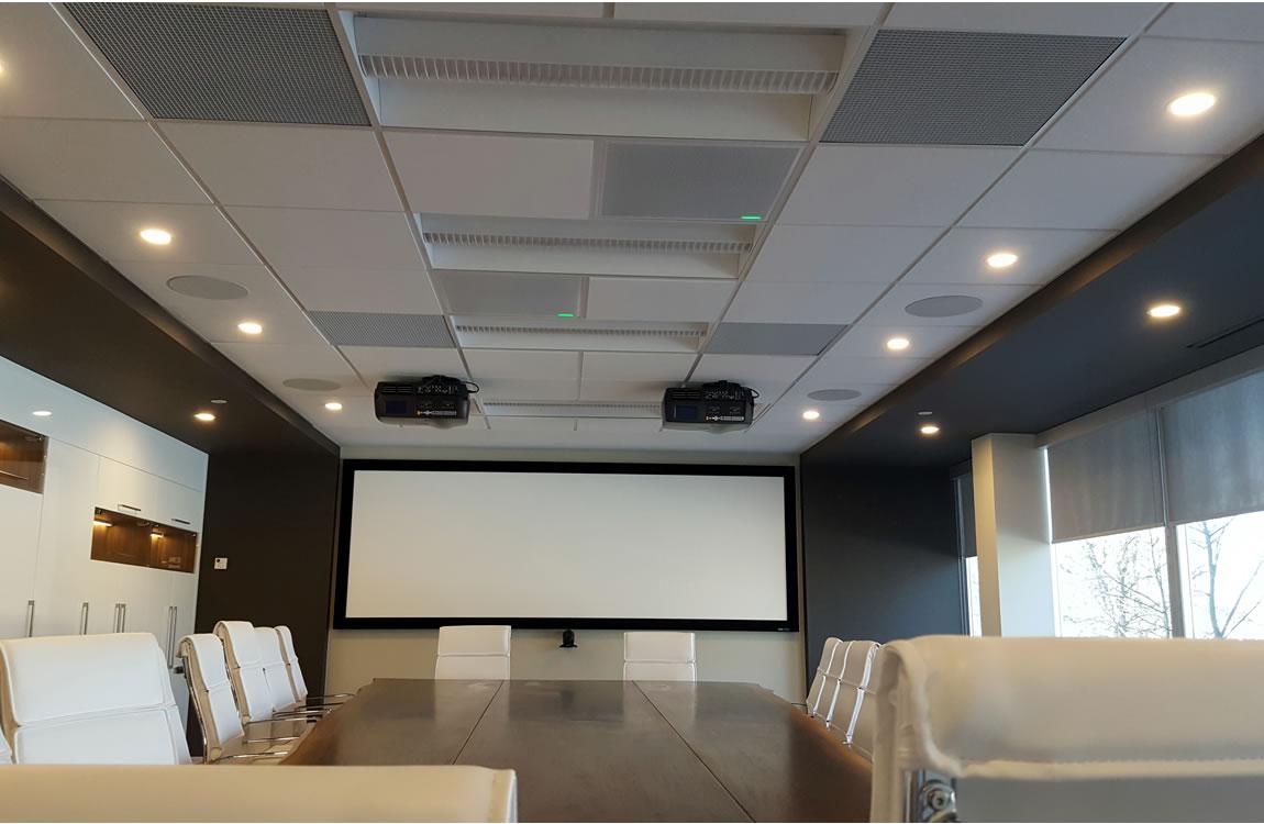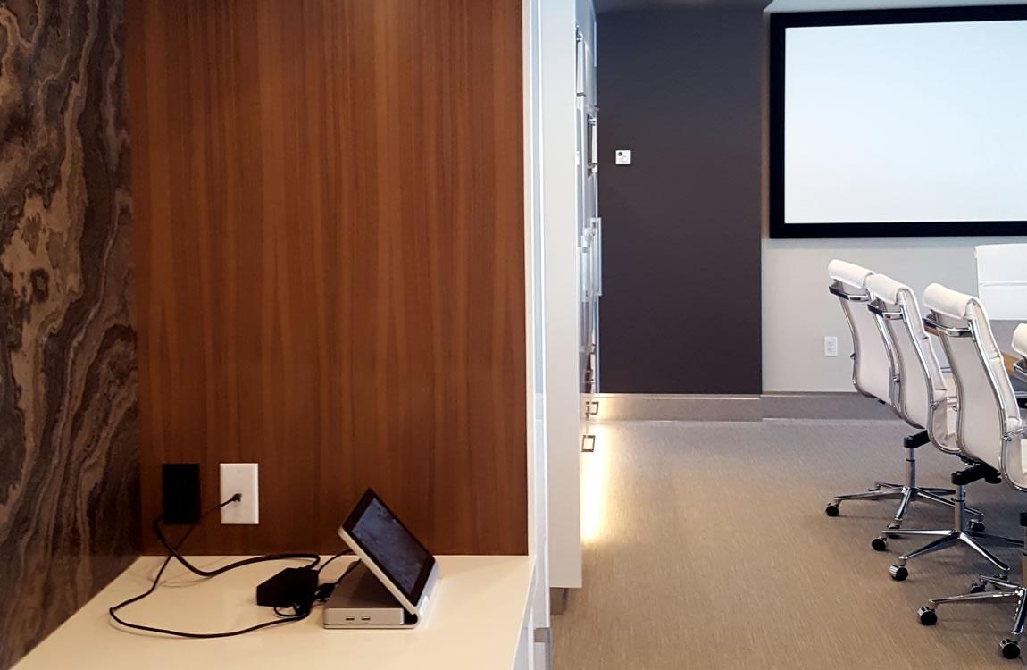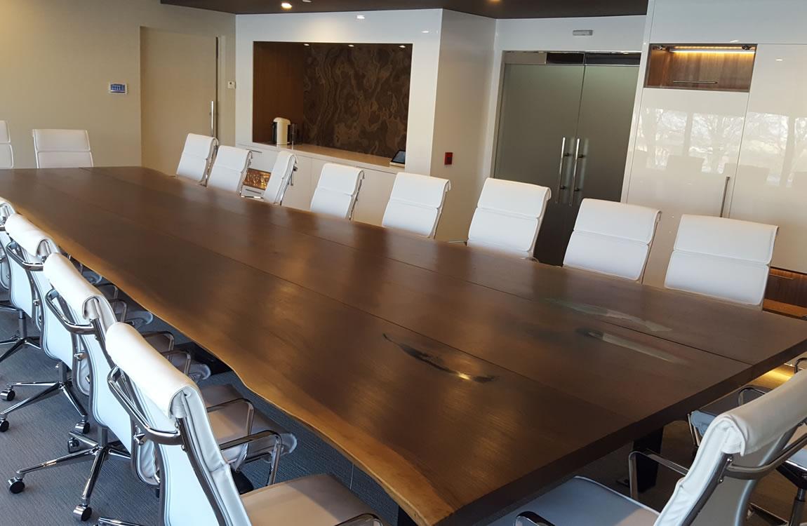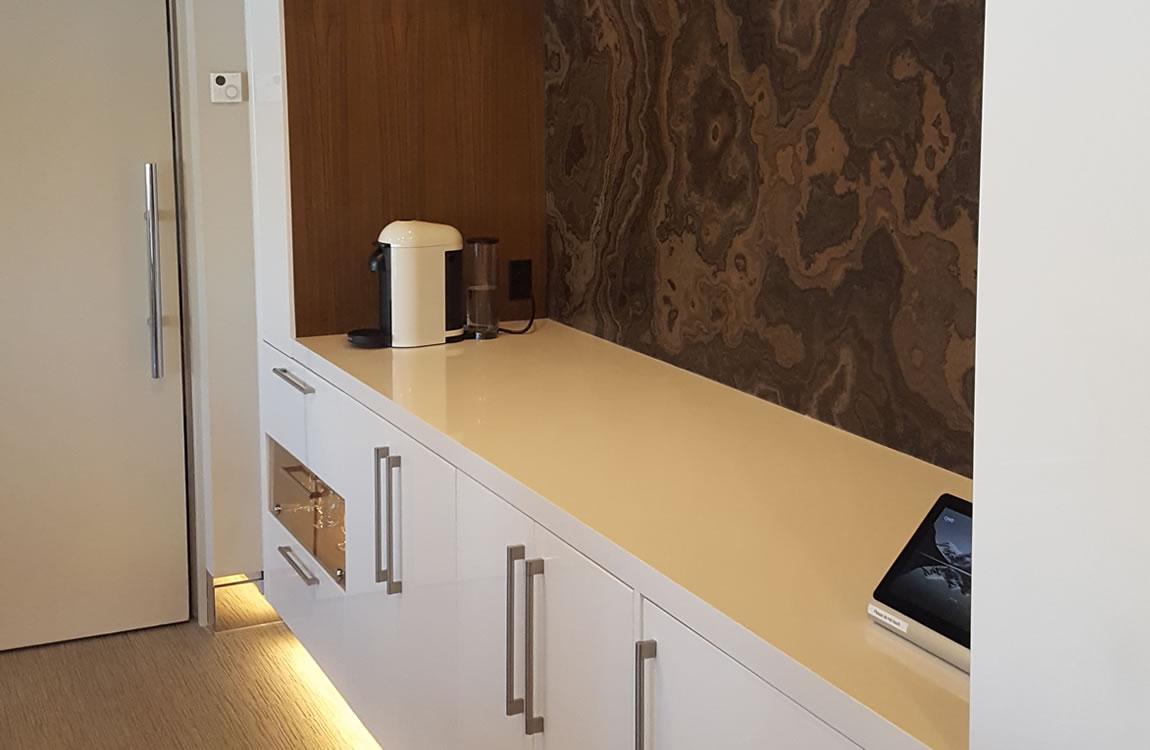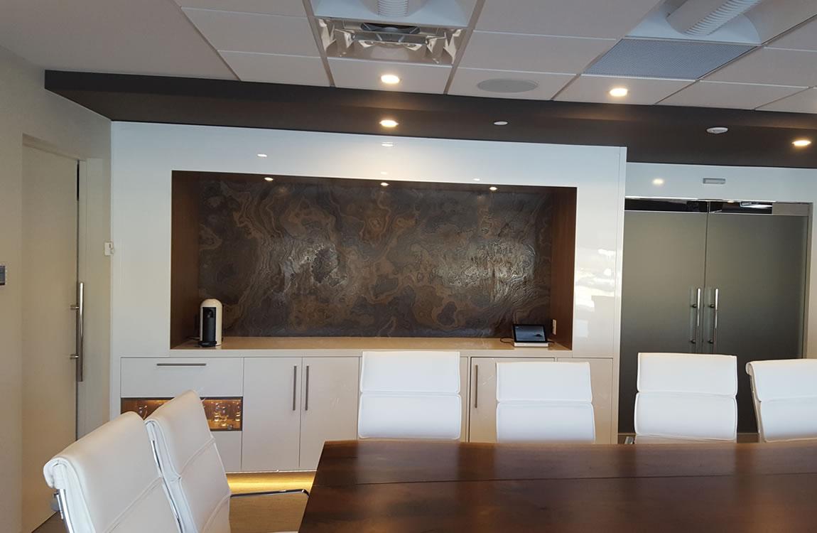 Renovation of company private President’s Board Room. Elegant finishes and simple contemporary design. The two millwork pieces were designed to integrate with main door creating a uniform look throughout the south side wall and making the main door as the focal point of the room.